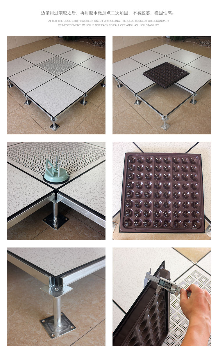 全鋼防靜電地板為全鋼組件,分有邊、無邊、微邊(三種邊處理方式)。底面采用SPCC深沖冷軋板拉伸成型鋼板厚度(0.4~1.5mm),球窩狀結構,增加地板的機械荷載強度。面板采用硬質SPCC鋼板(0.5~2.0mm),上下經過點焊焊接成型,切邊沖孔后,經防銹處理,環(huán)氧樹脂粉末靜電噴涂后,中間填充發(fā)泡水泥(可以根據客戶需求發(fā)泡不同重量),再經過日曬養(yǎng)護后形成穩(wěn)定的承載結構。地板上表層粘貼防火板(HPL)/復合PVC/ 通體PVC/陶瓷地磚等不同材質的裝飾表層,達到產品花色的多樣性、可以根據客戶需求個性化定制產品。搭配聯網支架、支架、螺釘組裝后,定位聯接更加準確、精度可靠。